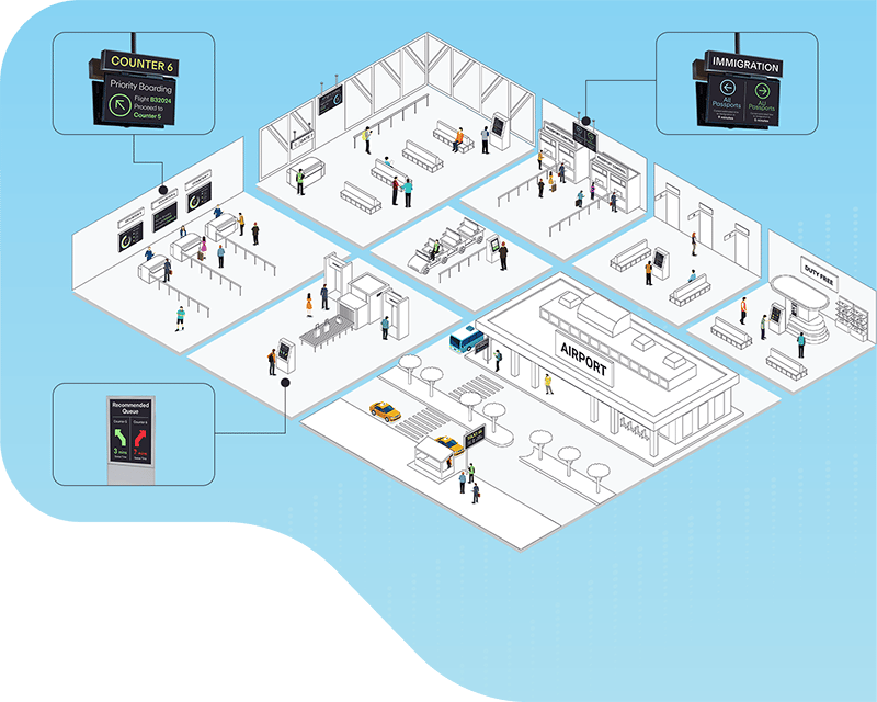 Eliminar o stress da espera em filas ou em pontos de serviço. Assegurar que os passageiros são mantidos informados com base em informações em tempo real sobre o fluxo de passageiros e as operações do terminal.